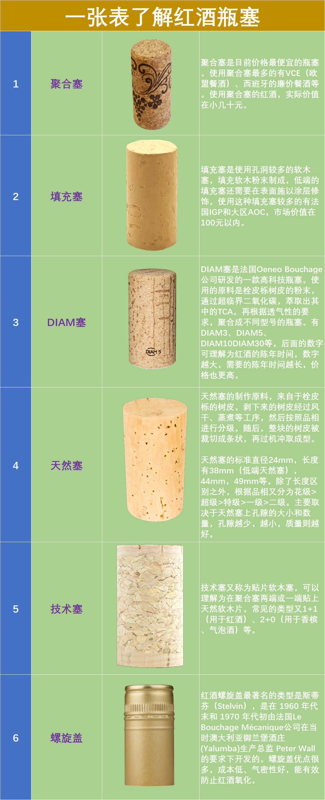 DIAM塞是法国Oeneo Bouchage公司研发的一款高科技瓶塞。使用的原料是栓皮栎树皮的粉末,通过超临界二氧化碳,萃取出其中的TCA。再根据透气性的要求,聚合成不同型号的瓶塞。有DIAM3、DIAM5、DIAM10、DIAM30等,后面的数字可理解为红酒的陈年时间,数字越大,需要的陈年时间越长,价格也更高。