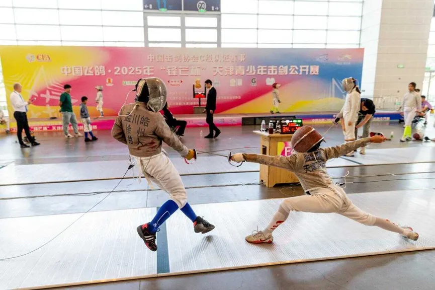 会展中心办比赛,已是第二年——2025年,这里举行,作为中国击剑协会认证的C级赛事,比赛吸引了来自北京、河北、江苏、山东、上海、广东等地的近2千名青少年选手,也在本市首开“体育赛事进专业展馆”。