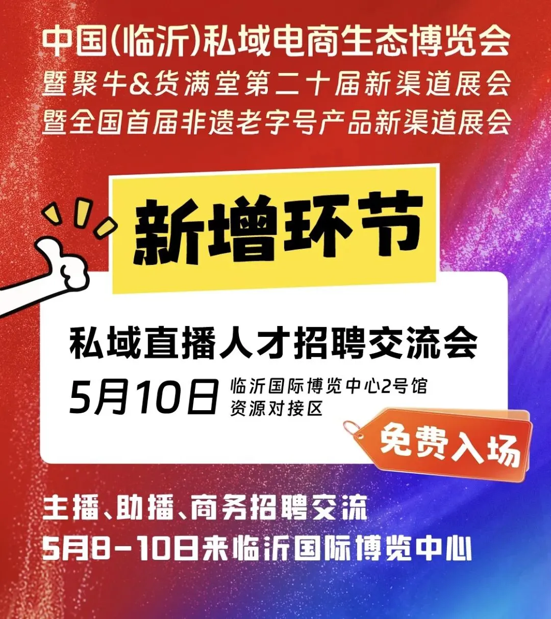 5月8日-5月10日,中国(临沂)私域电商生态博览会暨聚牛&货满堂第二十届新渠道展会盛大启幕,本次展会重磅新增私域直播人才招聘交流会,于5月10日在临沂国际博览中心2号馆资源对接区正式开启,全程免费入场,为行业人才供需搭建高效对接桥梁,为产业发展注入全新活力!