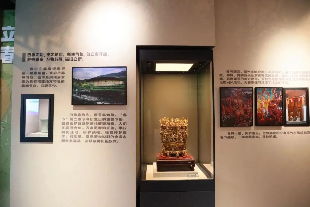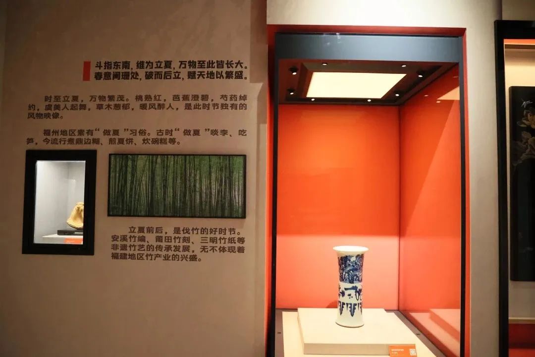 该展览以二十四节气为主线,分为春生、夏趣、秋兴、冬藏四个篇章,共计83件/套(100件)展品,融合民俗文物、传统闽作艺术、中国传统色彩、诗词等元素,赋予节气文化新的内涵,别具匠心地展现闽风民俗的独特魅力,呈现福建地区传统农业社会和文化艺术生活的微缩,让参观者在展览中探寻闽式浪漫生活。