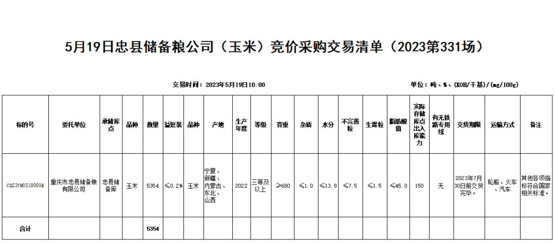 受重庆市忠县储备粮有限公司委托,重庆市粮油批发市场有限责任公司(即国家粮食重庆交易中心,以下简称“批发市场”)定于2023年5月19日10:00举办忠县储备粮公司(玉米)竞价采购交易会,现将有关事项公告如下: