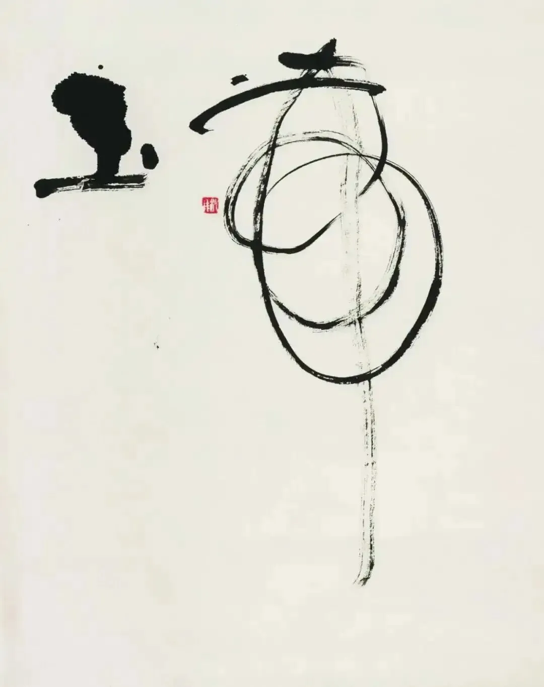 本次展览汇聚了众多经典之作,其中数件重点作品尤为引人入胜。唯一一件画作《自画像》是先生“书画同源”理念的生动实践,笔墨既是字,亦是画,书与画在情感宣泄的顶点融为一体。草书《玉带》则展现了先生对空间构成的天才驾驭——大面积的留白与墨线的奔突形成强烈对比,笔墨聚散之间暗藏精妙的三角构图,于险绝中见平衡,让人感受到“计白当黑”的东方美学智慧。而《古诗十九首》长卷则是先生“小草”书风的典范之作,通篇连绵不绝、心潮澎湃,字字如江河流水,笔笔似行云舒卷,将古诗中那苍茫悠远的意绪转化为一条奔流不息的笔墨之河,极具韵律感与感染力。