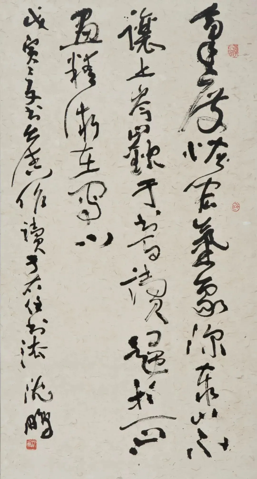走进展厅,首先映入眼帘的便是沈鹏先生那气韵生动、纵逸酣畅的草书世界。如果说书法是凝固的音乐,那么沈鹏的草书便是气势磅礴的交响乐——笔墨的疾驰与顿挫、章法的疏密与开合,如同交响乐中不同乐章的起承转合,充满了强烈的抒情性与生命张力,给予观者一种强烈的运动状态与丰富的层次感。在先生笔下,草书超越了技法层面,成为一种发自肺腑的“心画”,是其个人情感与哲思的直接奔涌。
