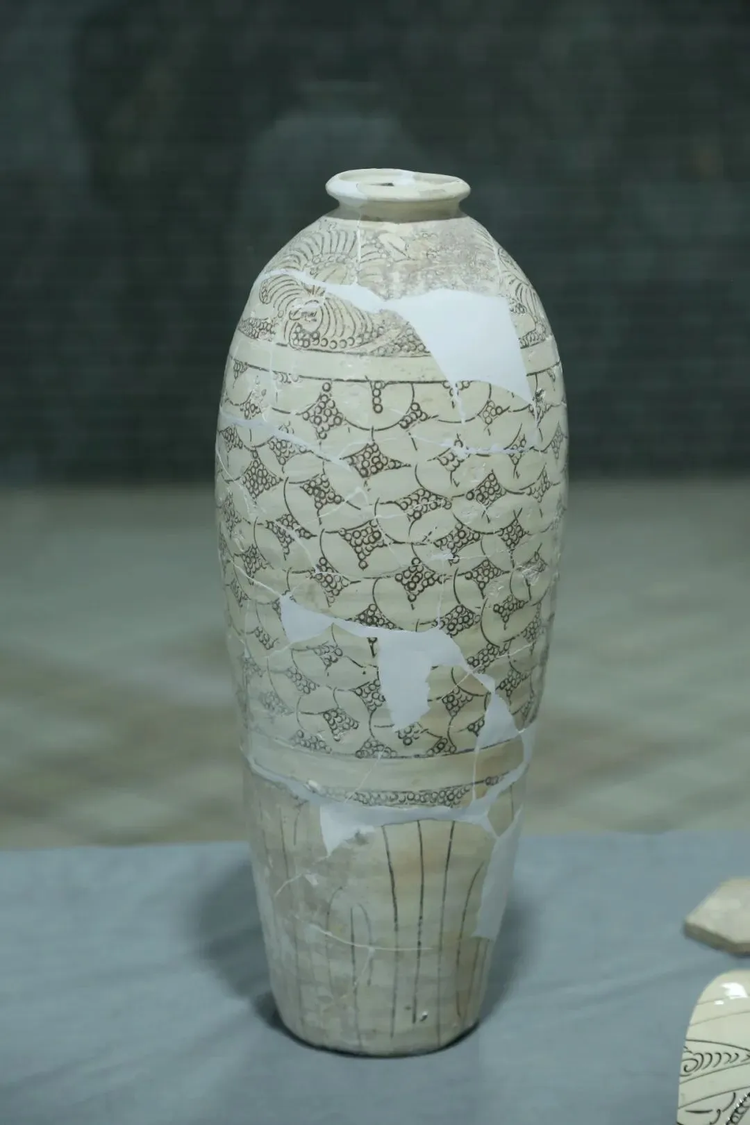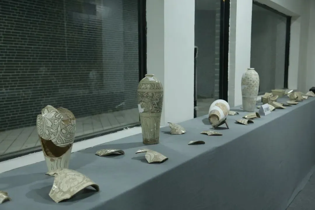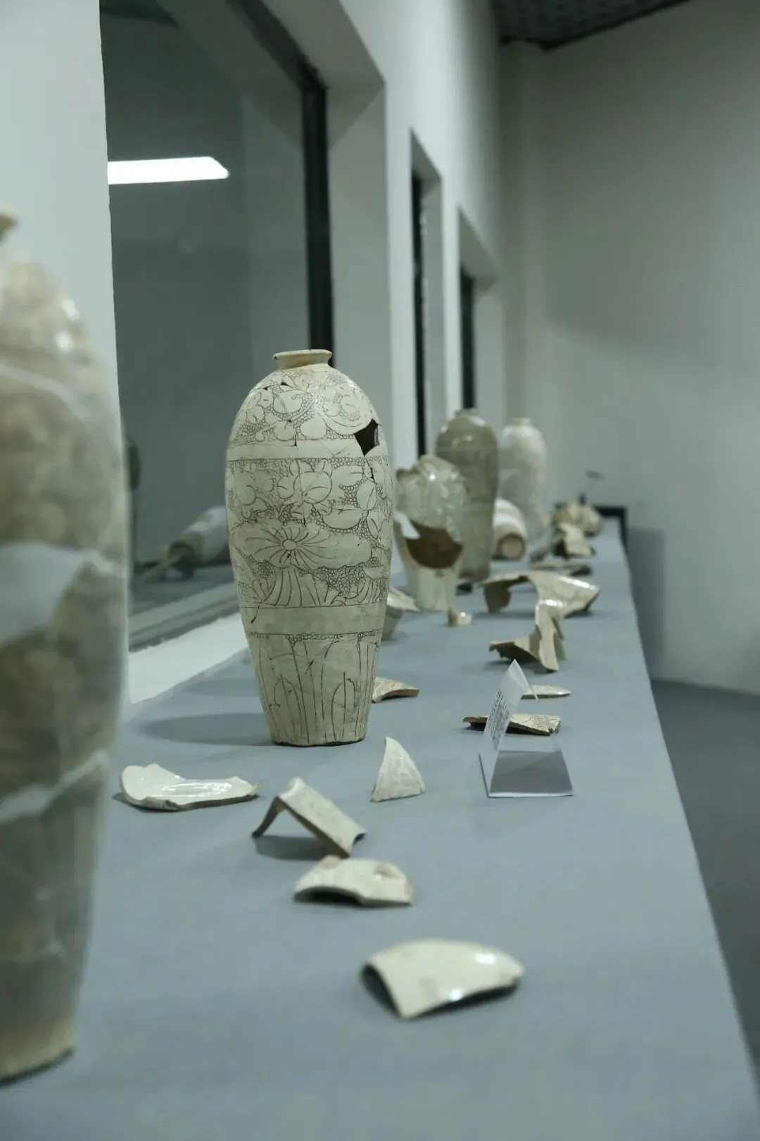 经石膏修复完整的梅瓶、各类器皿错落陈列