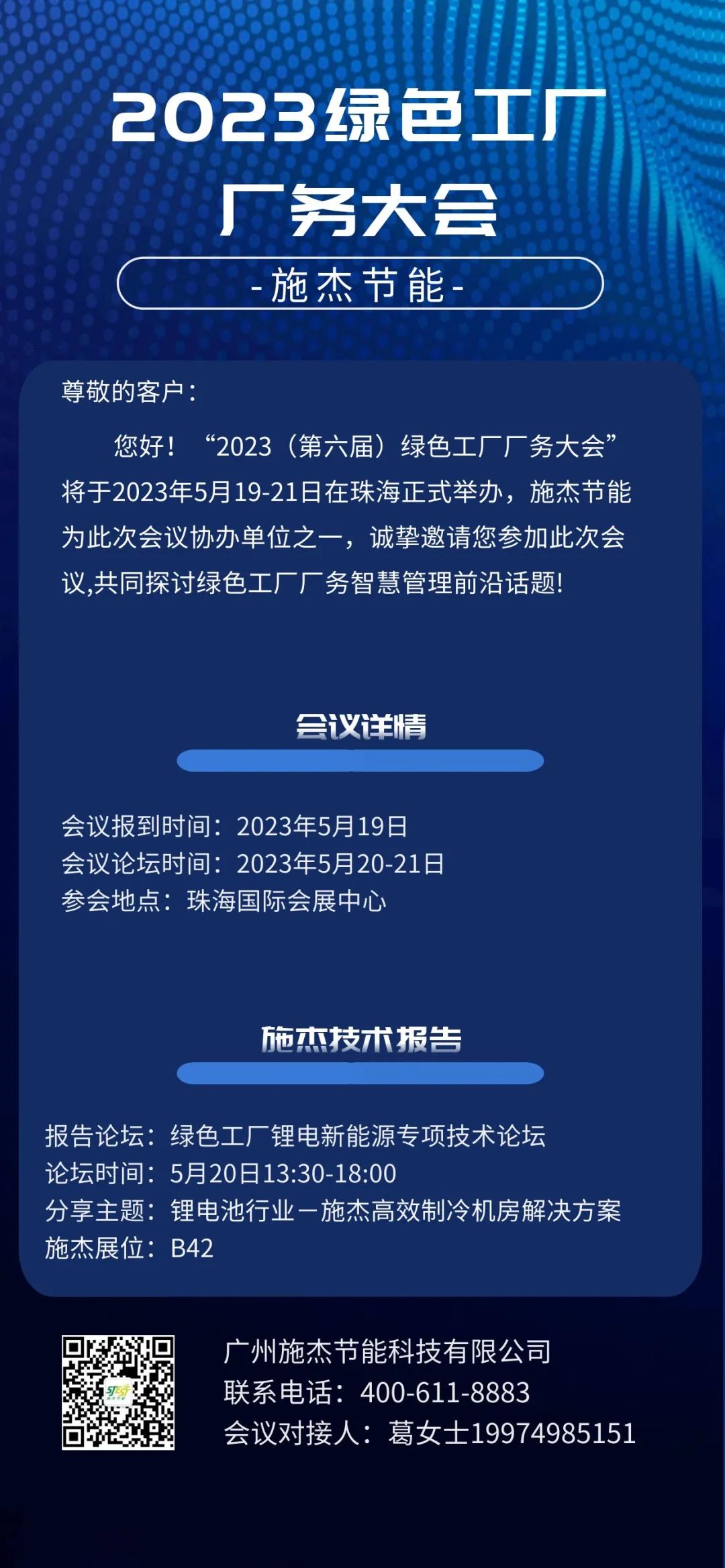 5月19-21日,2023(第六届)绿色工厂厂务大会将于广东珠海举办,本届大会主题“绿色、低碳、智慧、环保”。施杰节能作为本次大会的协办单位,将出席参展并分享锂电池行业高效制冷机房解决方案,届时与您不见不散!施杰节能成立于2007年,是专注于中央空调能效优化与产品研发的国家高新技术企业,也是国内较早开展高效机房市场化推广的全过程节能服务商。公司以“成为中国高效制冷机房市场领跑者”为愿景,围绕高效机房“深化设计—设备采购—施工建造—能效维保”建立了成熟的业务服务体系。全力打造高效机房全过程节能顾问服务、EPC总承包服务、制冷机房精准计量与智能群控系统、能效维保等多项核心业务;拥有多项核心技术和自主知识产权,获得多项专利证书。·2022绿色工厂厂务大会(重庆)精彩回顾