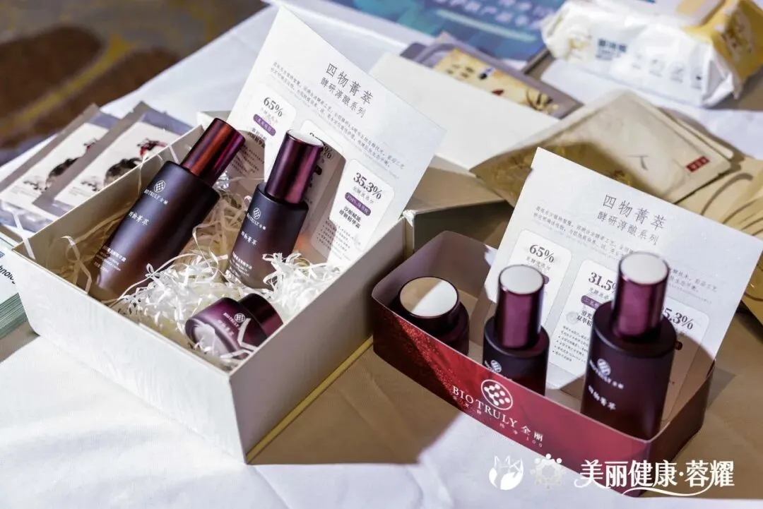 全丽旗下 高比例植萃发酵方品牌【四物菁萃】首发展示,展出了酵研淳酿系列三件套产品,包含源初淳酿润颜精华露、澄光酵语双萃精华油、淳酿赋能酵妍精华霜。