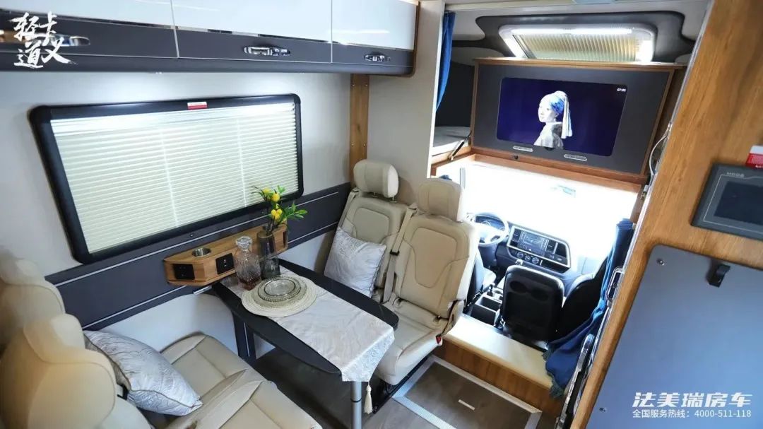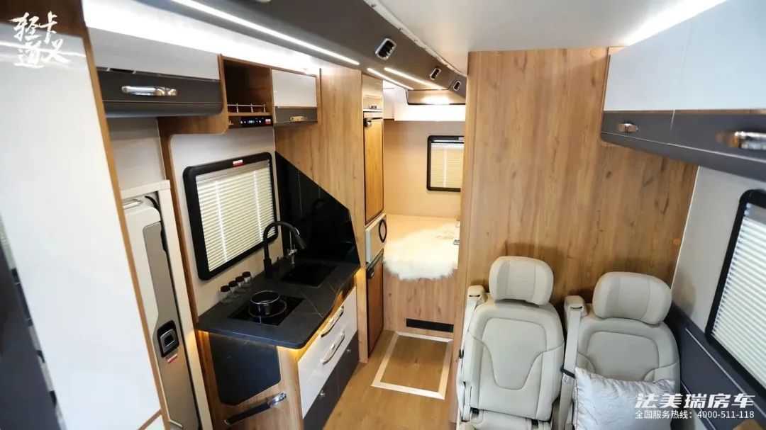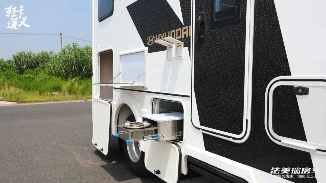 车身尺寸长度不足6米,依然是蓝牌C本就能开,车身白色为底色,配合黑金色拉花线条,配色轻快明亮,外部配置有抽拉式的柴油灶,遮阳棚下还有照明灯,2000升的贯通式的储物仓,能够装下更多大件行李,水电接驳口,以及门联动踏步。