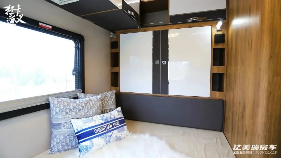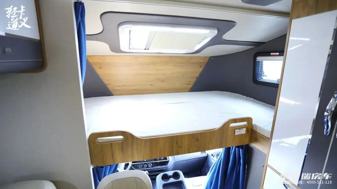 额头床相比一般的c型房车的额头床来说,头部空间会更加充足,让身材高大的人也可以睡在这里,不会感到压抑,还配备海绵床垫,左右都开窗,头顶的大天窗更方便我们欣赏美景,床板上掀是32寸小米电视。