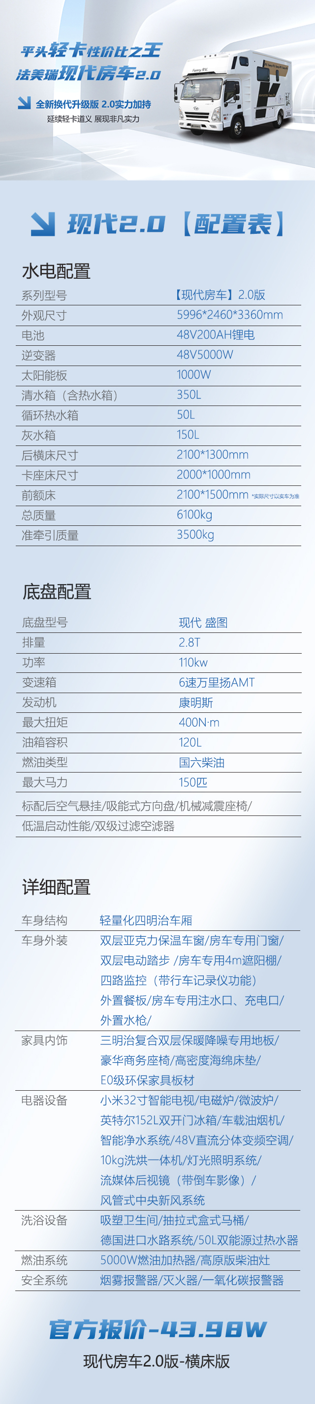 水电配置,48v200AH磷酸铁锂电池,5kw充逆变一体机,1000w的太阳能,300L的清水箱,50L循环过热水箱,80L的灰水箱,水箱并做了保温处理,让您冬日也用水无忧。