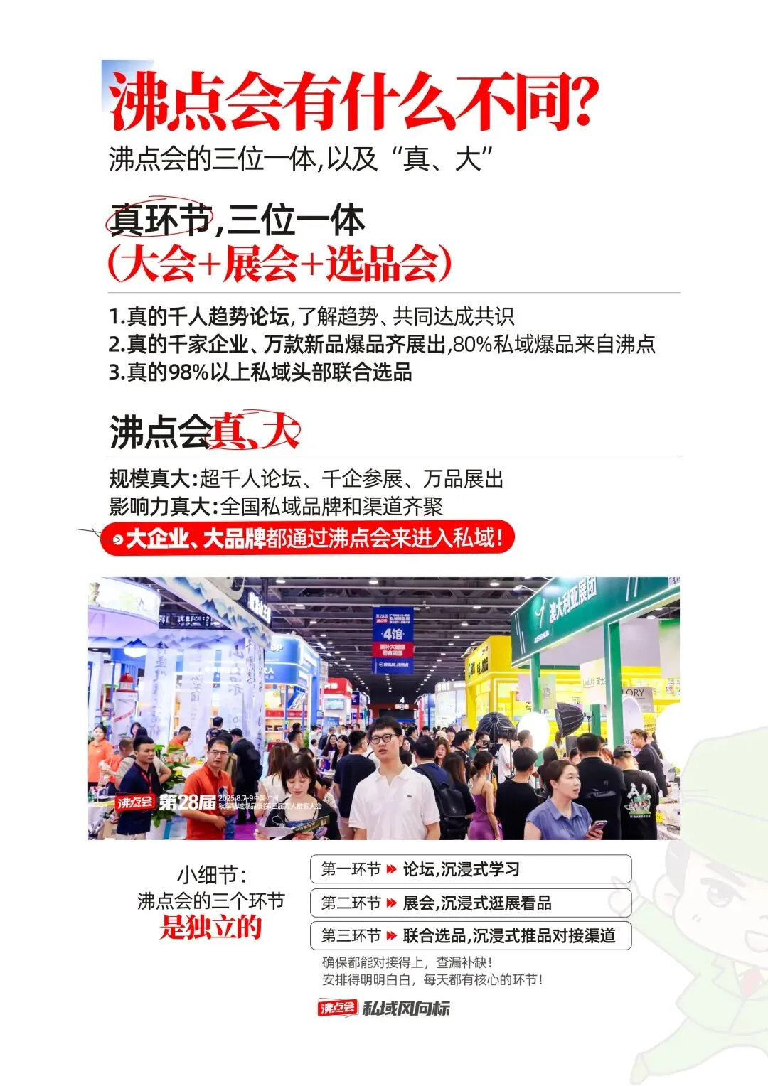 ✅ 玩法够全,闭环够稳从趋势论坛、案例峰会,到万品展览、百强渠道闭门对接会,从学习、选品到合作,3 天全流程闭环,让你来一次展会,搞定全年私域规划。