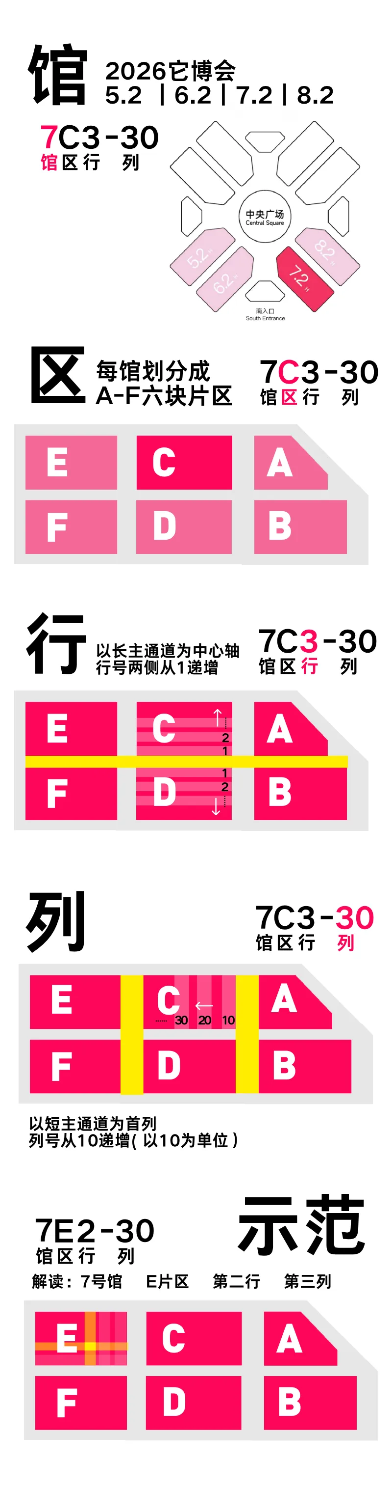 由于单体展馆面积很大,为提升寻位效率,今年它博会的展位编码全新升级,所有展馆统一划分为A/B/C/D/E/F六大区域。