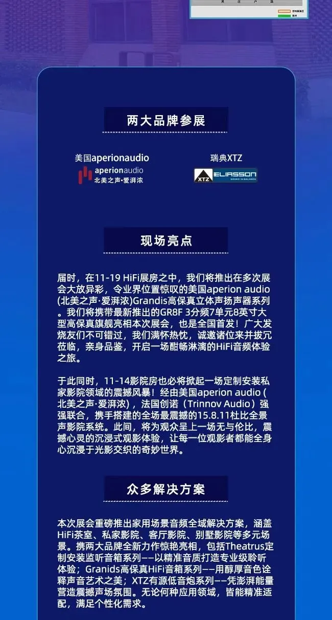 本次展会,我们为观众精心筹备了众多新品首秀。其中,北美之声·爱湃浓(aperion audio)倾力打造的全场最强Theatrus 15.8.11杜比全景声影院系统,凭借别具一格的设计理念与超凡卓越的性能表现,必将吸引全场目光,成为焦点所在;与此同时,Bravus III大型有源低音炮系列也将霸气登场,以排山倒海之势为观众带来前所未有的低音震撼体验。此外,全国首发的Grandis高保真高端HiFi旗舰级扬声器GR8F,即将隆重登场,其凭借精湛的工艺技术与出类拔萃的音质表现,必将引领发烧音响领域的新风尚。