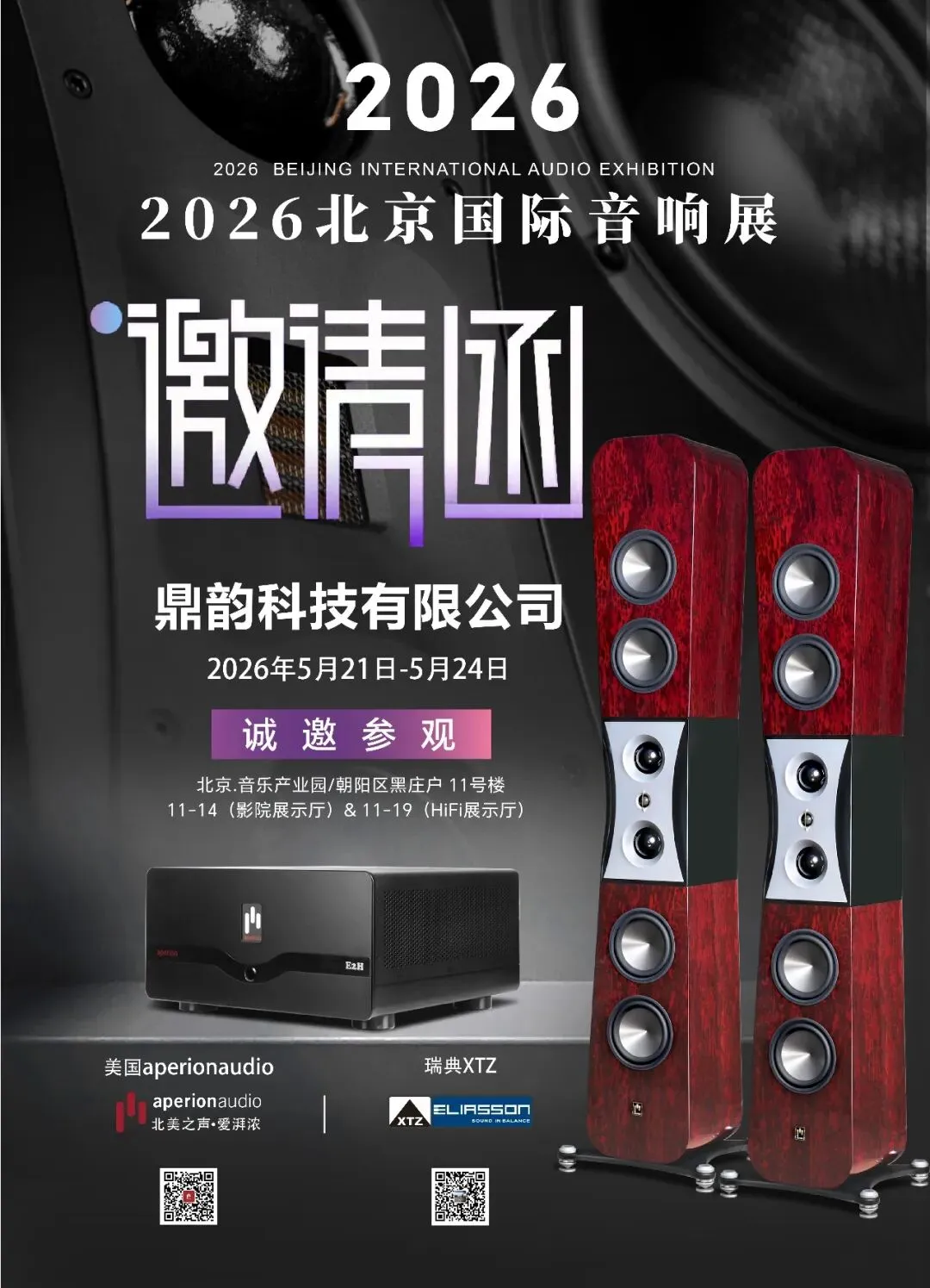 在即将开幕的2026北京国际音响展上,鼎韵科技将重点展出美国北美之声·爱湃浓(aperion audio)旗下四大产品系列:全国首发的Hi-Fi高保真旗舰音箱Grandis GR8F,广受私家影院领域赞誉的定制安装监听级T系列扬声器,大功率HiFi音质E系列后级功放,以及大型双15寸B系列B215有源低音炮。