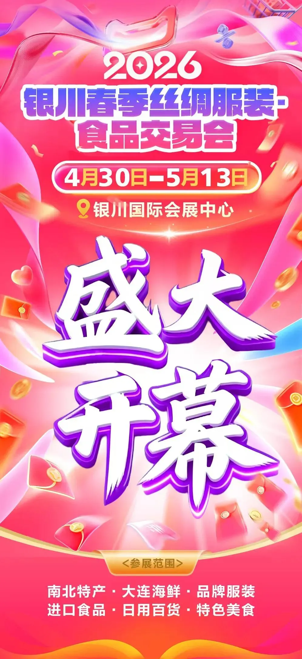 银川春季丝绸服装食品交易会,于银川国际会展中心盛大启幕,与宁夏五一国际车展双展联动、逛购一体,以丝绸为韵、以美食为媒,为全城市民及游客打造一场集穿搭焕新、味蕾狂欢、便民惠民于一体的春日消费盛宴,承包你整个春天的美好与实惠,诚邀各界人士共赴这场热闹非凡的盛会!