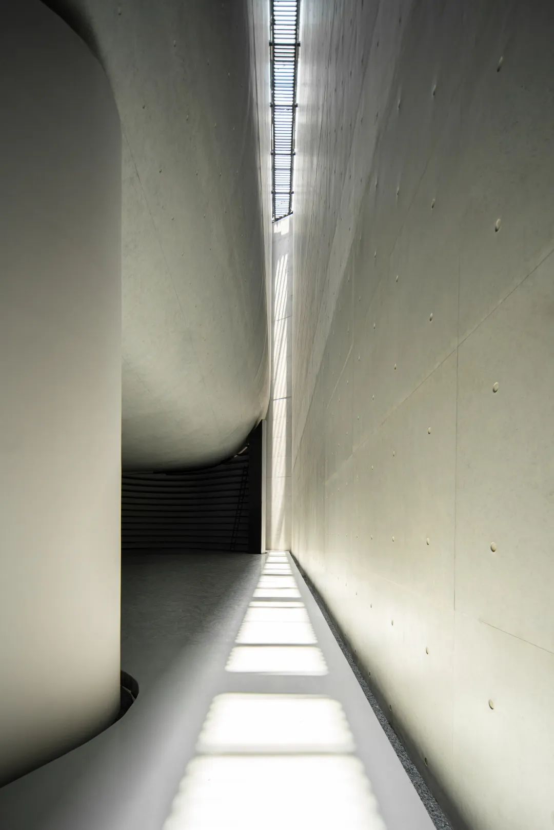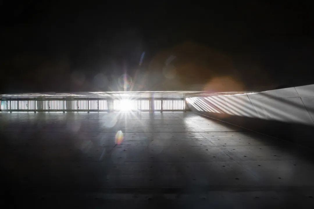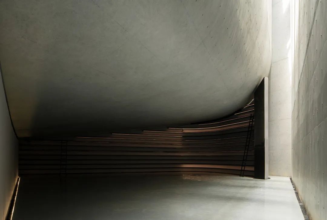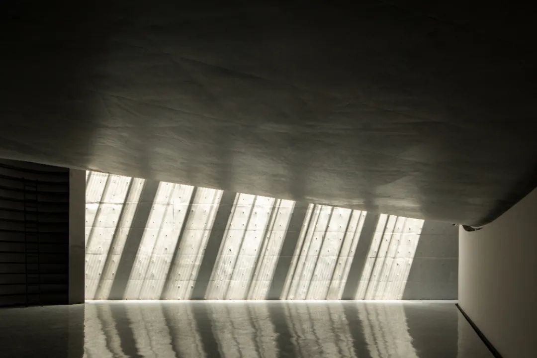 建筑的室内空间由混凝土墙和屋面构成。阳光从 24 米高的狭缝直射地面,营造了哥德式教堂般高耸宁静的气氛。让人安静下来,阅读,思考。