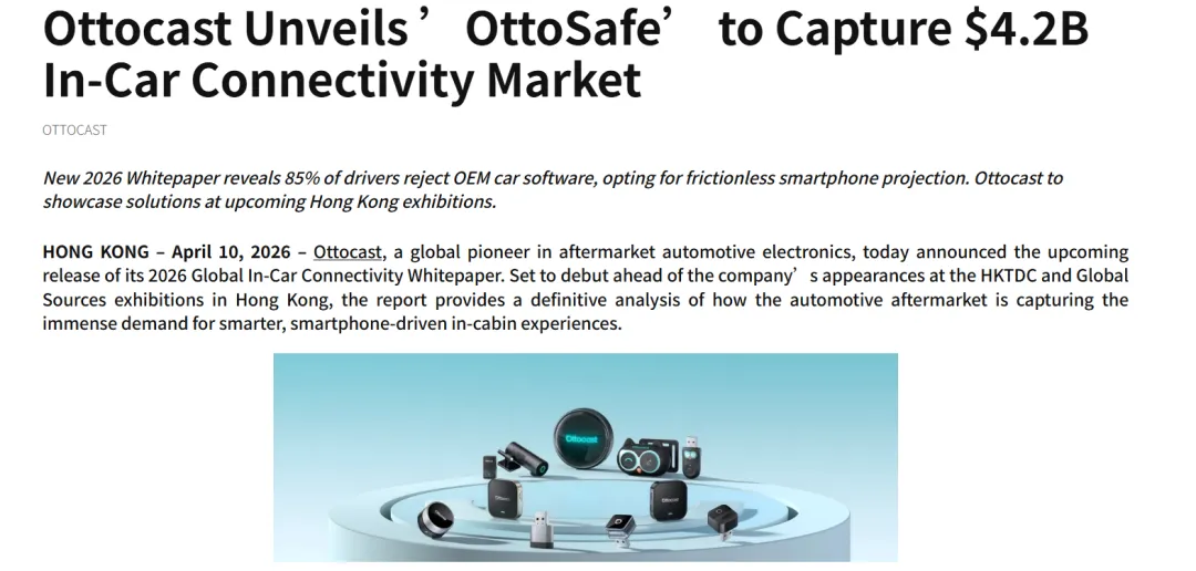 "Ottocast 正式推出全新 OttoSafe 系列,剑指 42 亿美元的车载互联市场。"