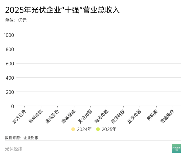 在全球能源转型加速、光伏产业进入深度调整期的背景下,「光伏经纬」以营业总收入为参考标准,筛选出2025年光伏“十强”,结合营收、净利、资产、负债若干维度,系统分析企业2025年的经营概况。其2024-2025年的财务数据不仅反映了企业自身的经营韧性,更折射出整个光伏产业的发展态势。