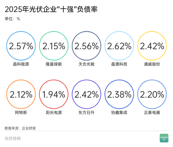 资产负债率方面,2025年光伏行业整体资产负债率为63.20%,十佳企业负债率呈现明显分化态势。