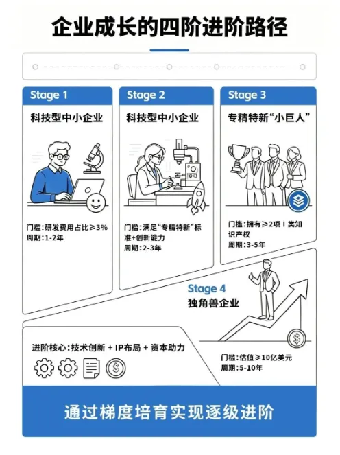 要知道,科技企业的发展绝非短期冲刺,而是一场有发展规律、有进阶方向的长期长跑。从体量偏小的科技型中小企业,成长为资本追捧的独角兽企业,企业需要跨越多重成长壁垒。