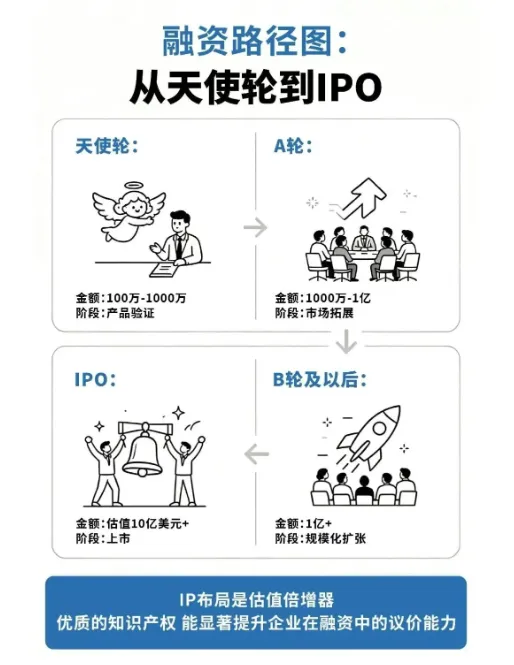 科技企业从天使轮发展至IPO有着清晰的成长轨迹,而知识产权布局是企业提升估值的关键助推器。合理的产权布局,能够帮助企业在每一轮融资中提升估值溢价,快速完成资本积累。