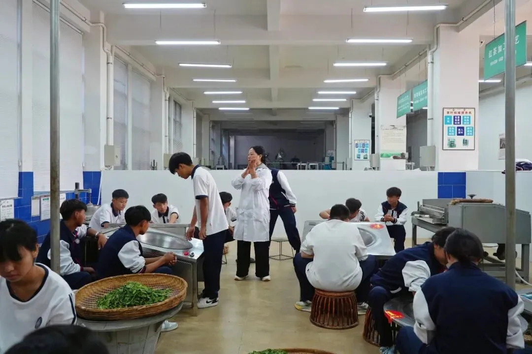 校企合作,双向赋能。茶叶生产与加工专业教研组组长高成伟说:“我们与企业共享设备和师资,让学生理论与实践深度结合,还能获得实践收益。”两家入驻企业各有侧重:一家聚焦直播新业态,一家深耕生产加工。生产季一到,学生直接上生产线,实现“实训即生产”。