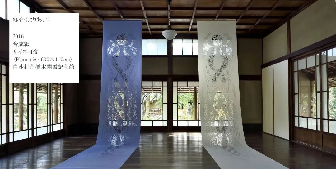 望月惠利用在一张纸上雕刻而成的剪纸所特有的张力和透明美感,在寺庙,茶室等传统建筑中创作了许多大型装置作品。近年来,他的作品主题涵盖中国神话和古代思想。她从历史遗产中汲取教训,重现人类的普遍精神。此外,由于对材料的兴趣,她持续续关注各国的造纸业。