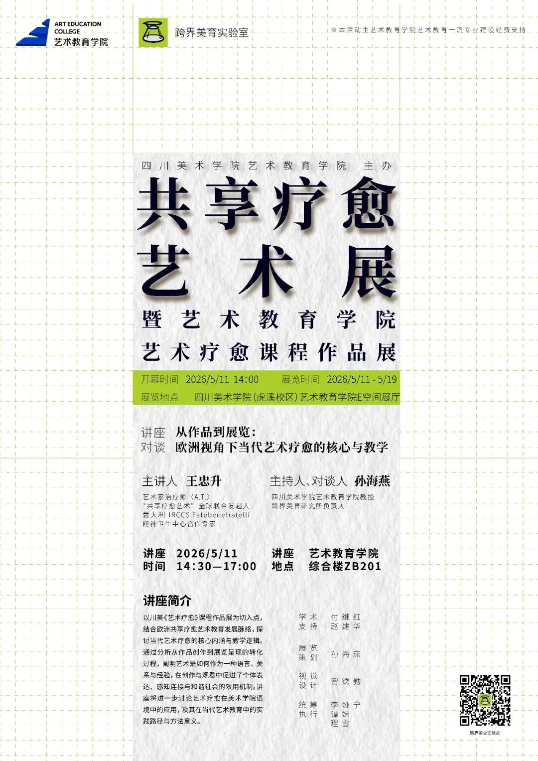本次讲座以川美《艺术疗愈》课程作品展为切入点,结合欧洲共享疗愈艺术教育发展脉络,探讨当代艺术疗愈的核心内涵与教学逻辑。通过分析从作品创作到展览呈现的转化过程,阐明艺术是如何作为一种语言、关系与经验,在创作与观看中促进了个体表达、感知连接与和谐社会的效用机制。讲座将进一步讨论艺术疗愈在美术学院语境中的应用,及其在当代艺术教育中的实践路径与方法意义。