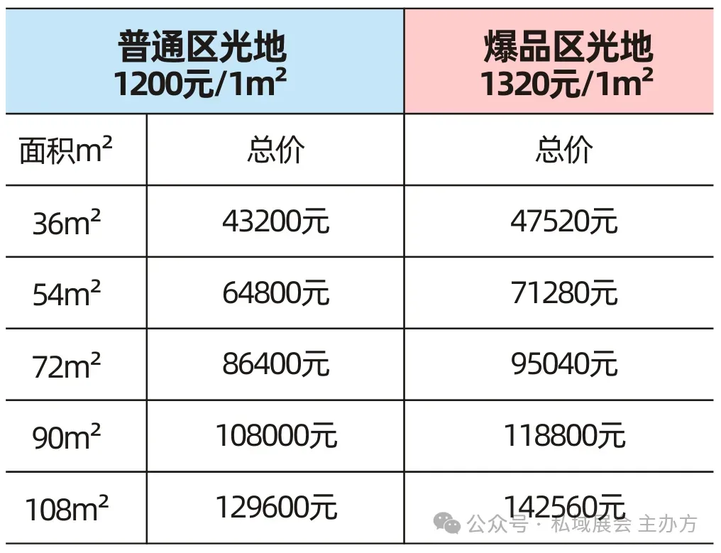 光地特装展位有36㎡、54㎡、72㎡、81㎡、108㎡、144㎡、180㎡等不同面积,,计费标准:1200元/㎡,爆品区加收10%。具体费用如下: