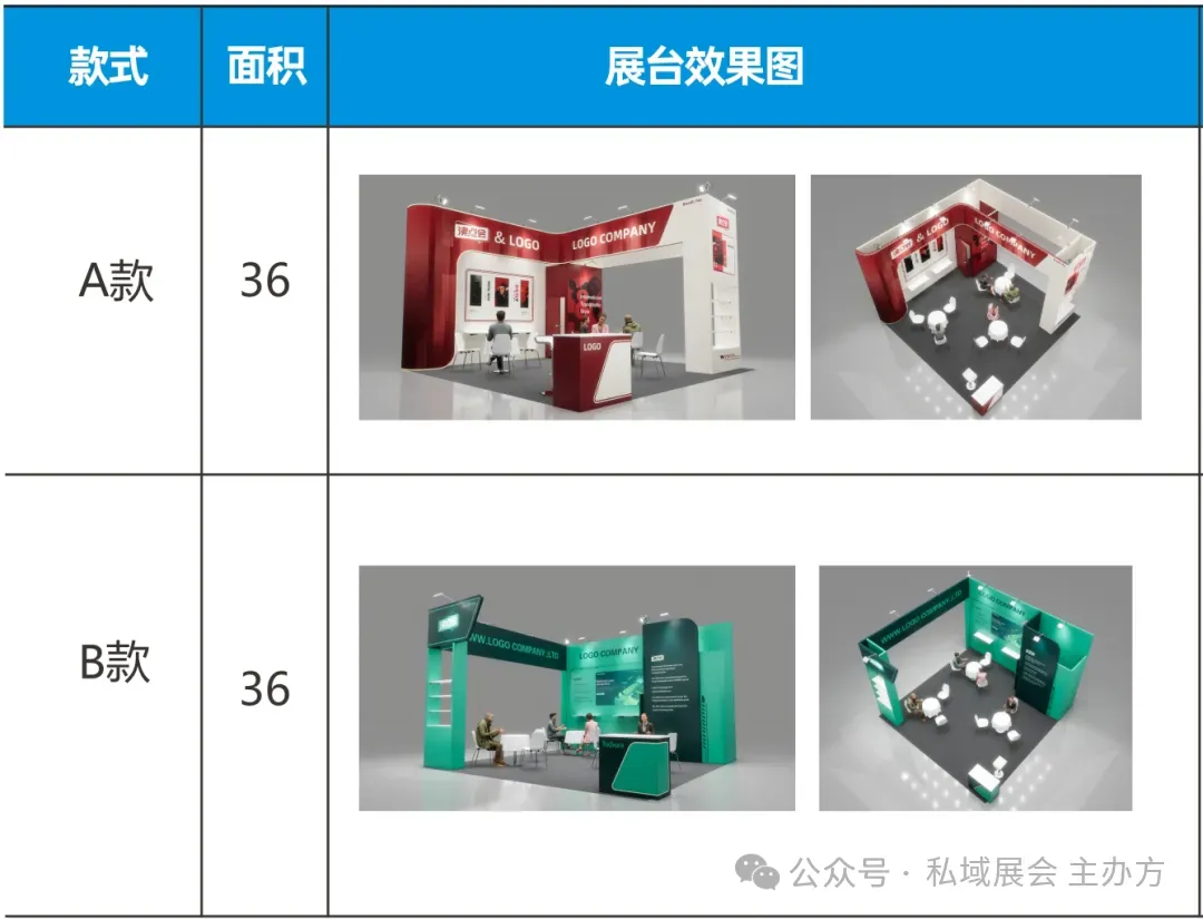 配置:含木制展位结构、门头泡沫字 LOGO 及企业全称、企业形象画面背胶、产品展示柜、接待台、5 套洽谈桌椅、展位基础照明等。