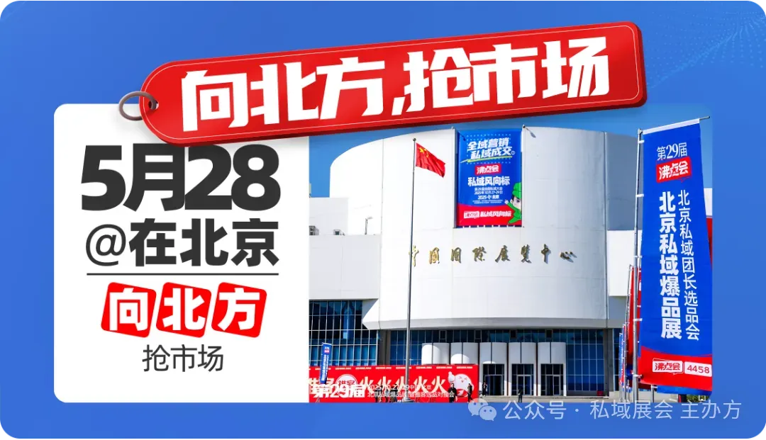 正式定档,5月28日-29日,将在北京·中国国际展览中心(朝阳馆)举办,聚焦私域全链路资源对接,帮你一站式打通北方市场,抢占年中旺季先机。本次展会以“向北方,抢市场”为核心,将带着全国渠道走向北方选品,也带着全国供应商链接北方的渠道。