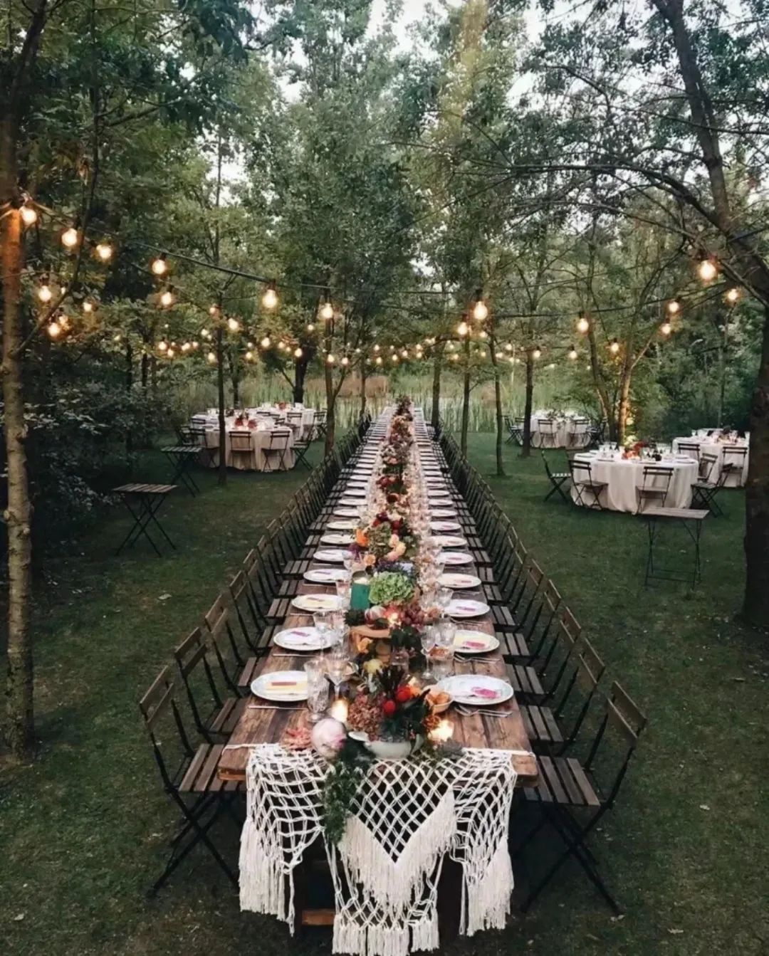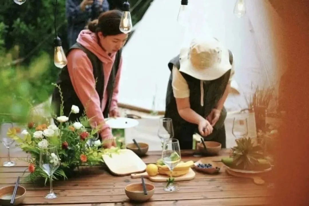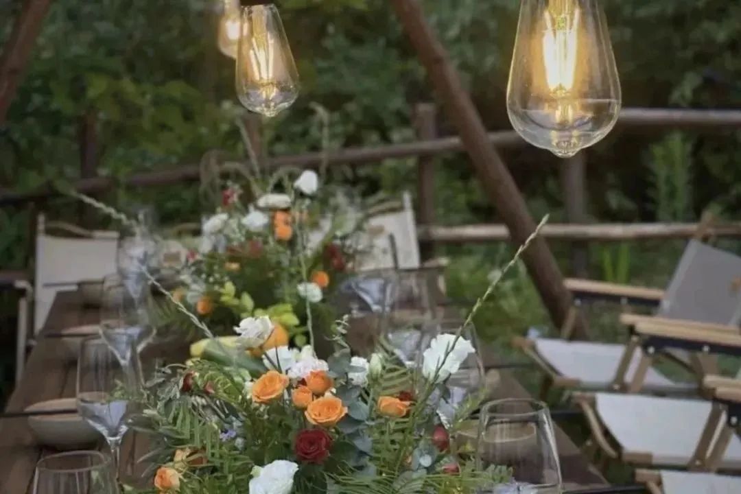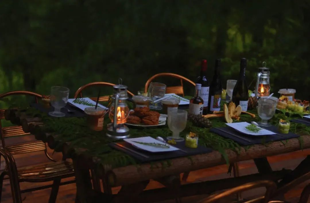 草垛木架、黑胶唱片、波西米亚地毯营造的欧洲乡村复古气息,如梦似幻。以水杉林为背景,构建出野生派对场景,森系餐桌、白色和绿色的主色调、烛台、星星灯饰...试想一下,在这样的风景里用餐?是多么极致的享受。