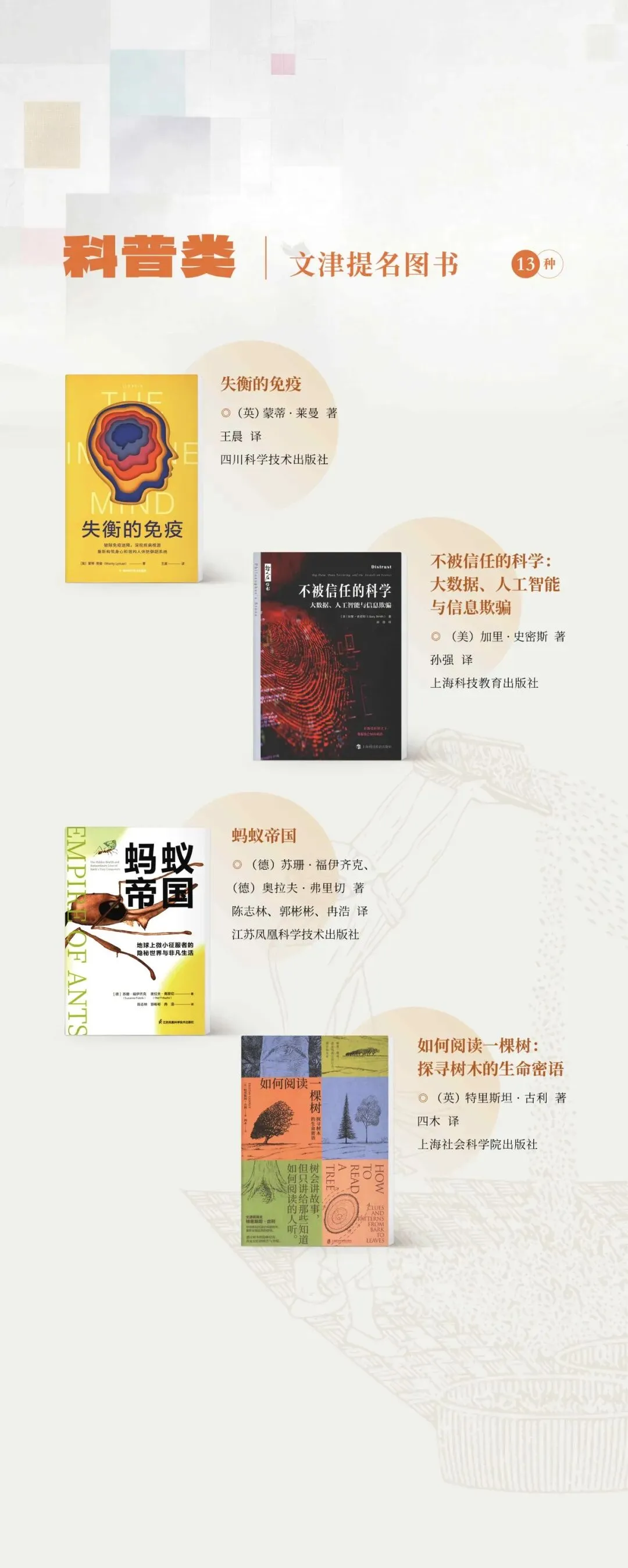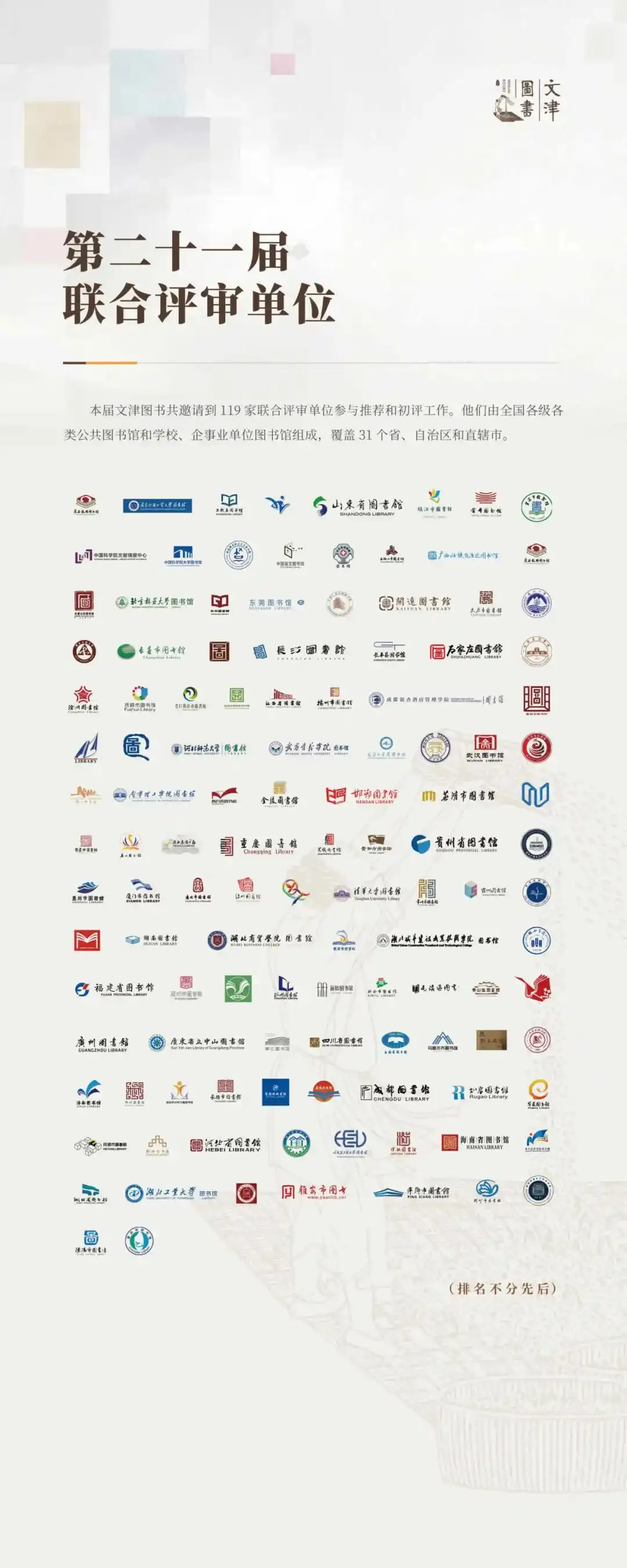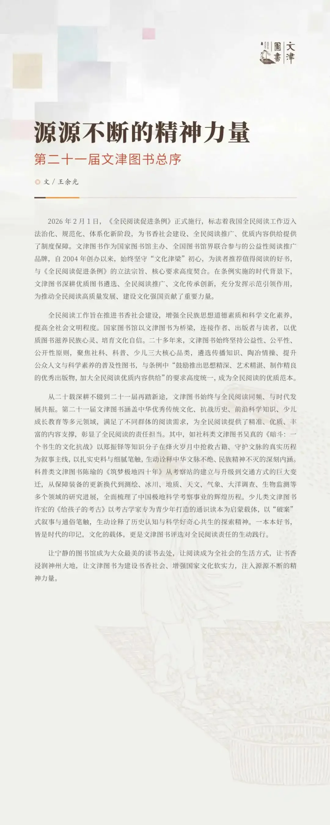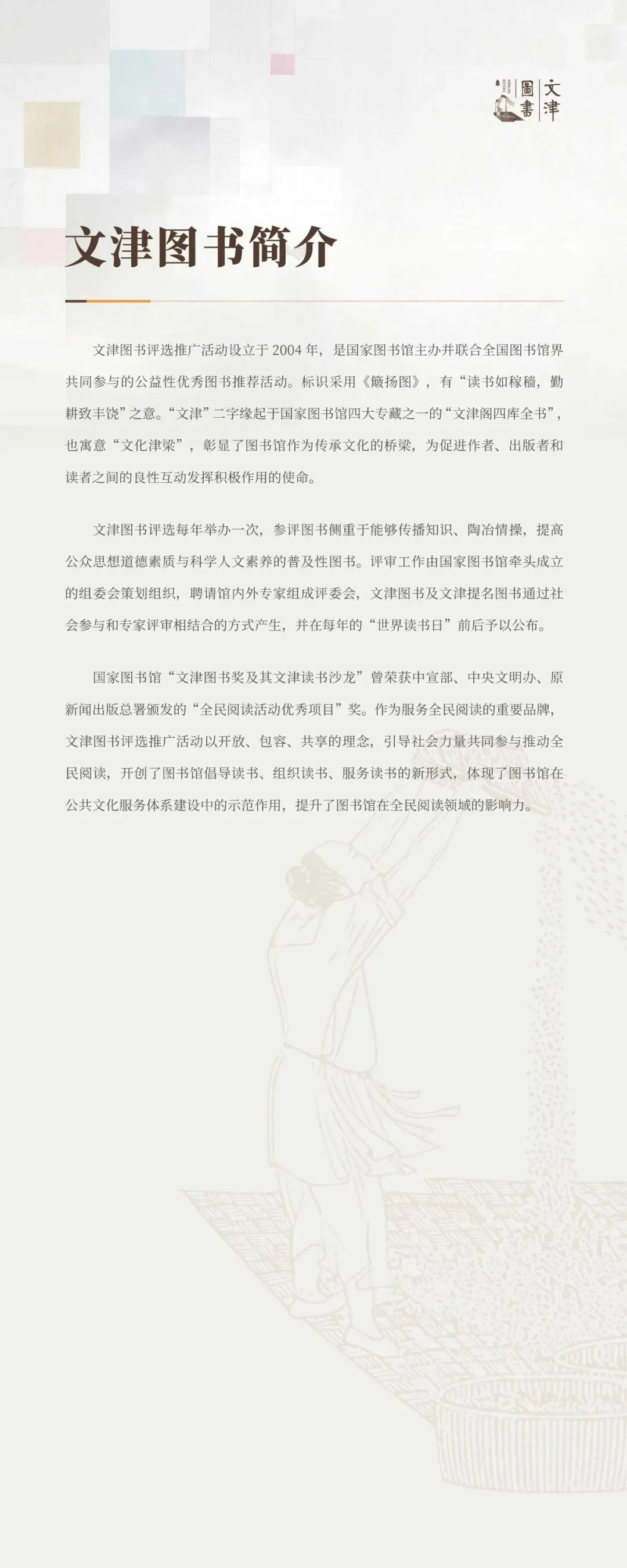 文津图书设立于2004年,是国家图书馆主办并联合全国图书馆界共同参与的公益性优秀图书推荐活动。第二十一届文津图书涵盖中华优秀传统文化、抗战历史、前沿科学知识、少儿成长教育等多元领域,满足了不同群体的阅读需求,为全民阅读提供了精准、优质、丰富的内容支撑,彰显了全民阅读的责任担当。一本本好书,皆是时代的印记,文化的载体,更是文津图书评选对全民阅读责任的生动践行。