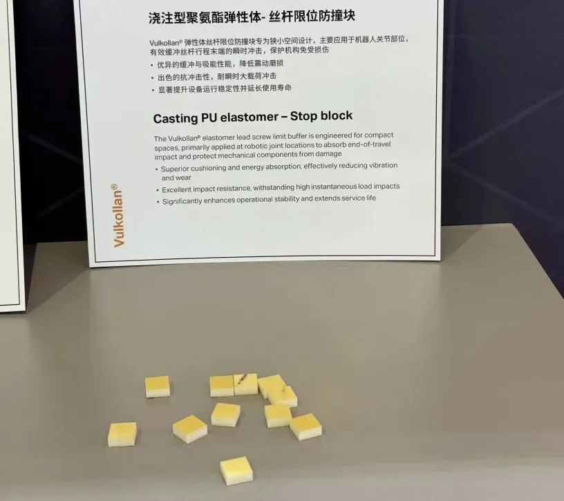 Vulkollan®弹性体丝杆限位防撞块专为狭小空间设计,主要应用于机器人关节部位,有效缓冲丝杆行程末端的瞬时冲击,保护机构免受损伤。