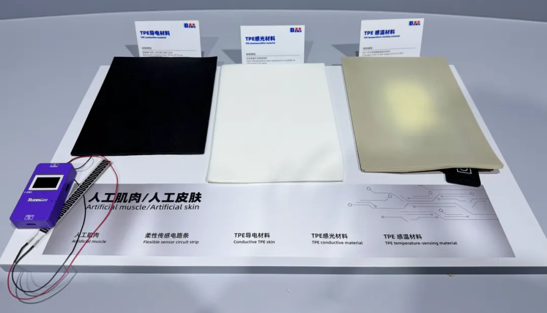 ▲人工肌肉/人工皮肤。TPE导电材料:电阻率10的二次方到10的六次方;TPE感光材料:日光或紫外光照射显色;TPE感温材料:0℃~70℃区间随温度变化变色。