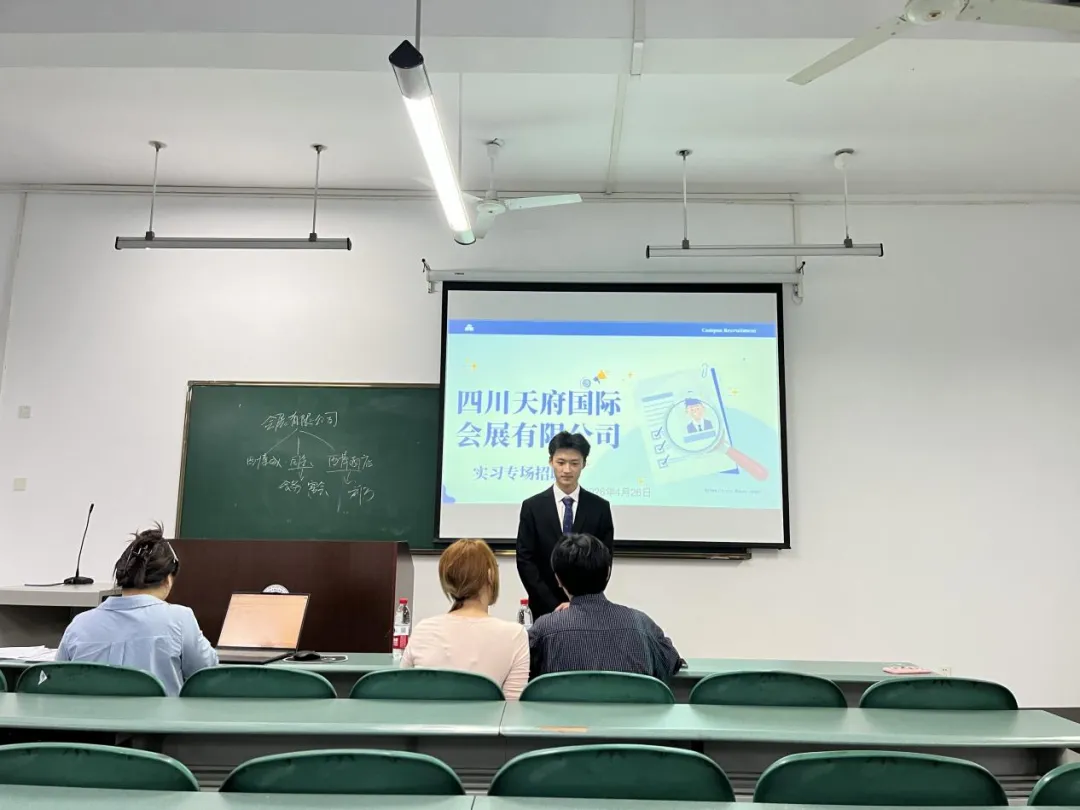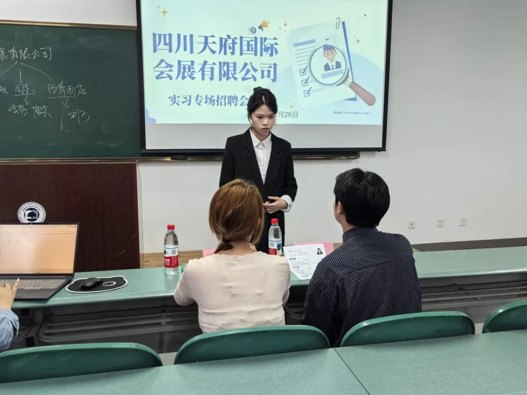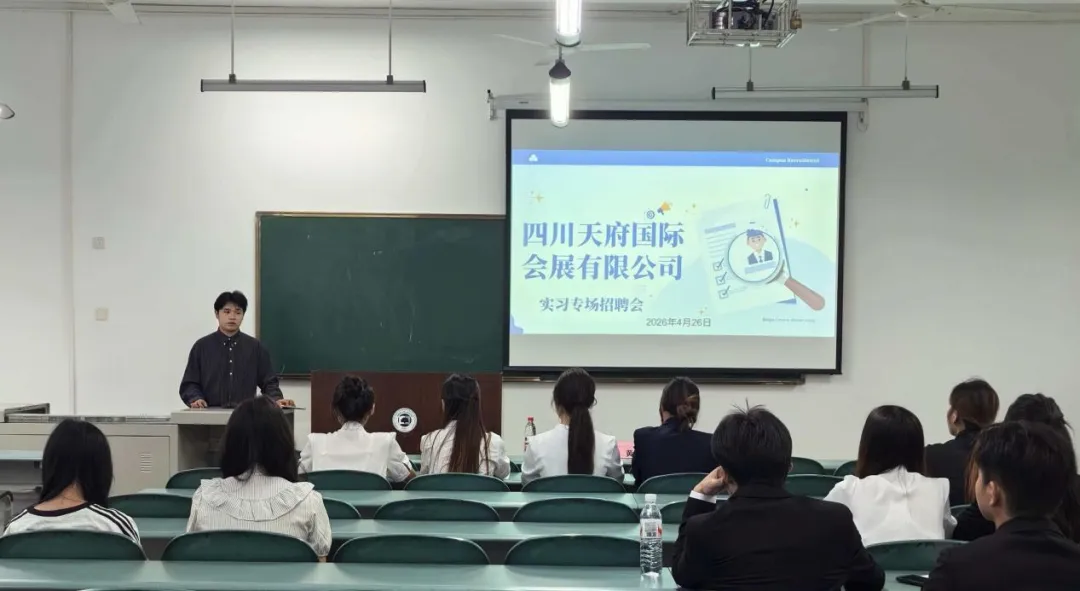 为深化校企协同育人机制,拓宽学生实习实践与职业发展渠道,全面提升学生职场竞争力与综合素养,近日,学院在明德楼A2305教室顺利举办四川天府国际会展有限公司实习专场招聘会。本次招聘会吸引了学院众多学生积极参会,活动组织有序、流程规范、现场氛围热烈。