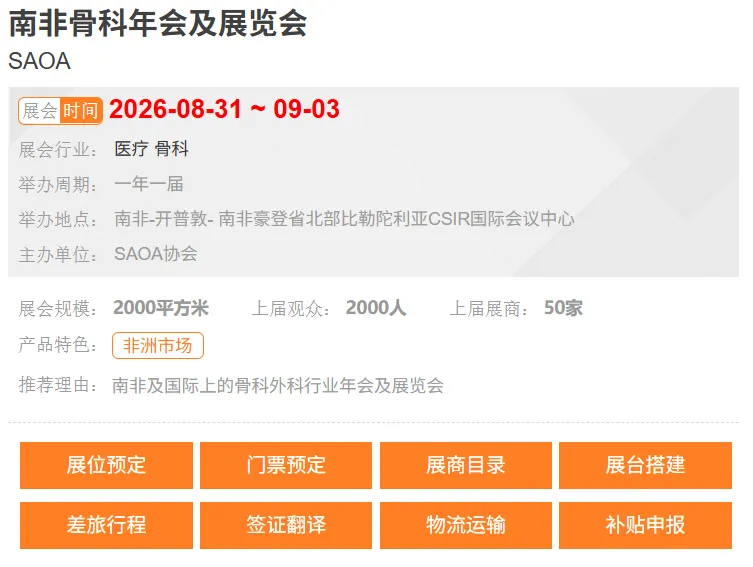 观众总人数: 3,250 人 增长 12.5% 非洲骨科领域规模最大的专业会议之一,包含会议注册代表与展览观众