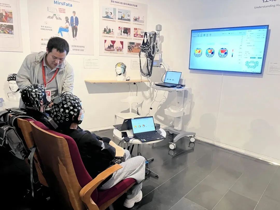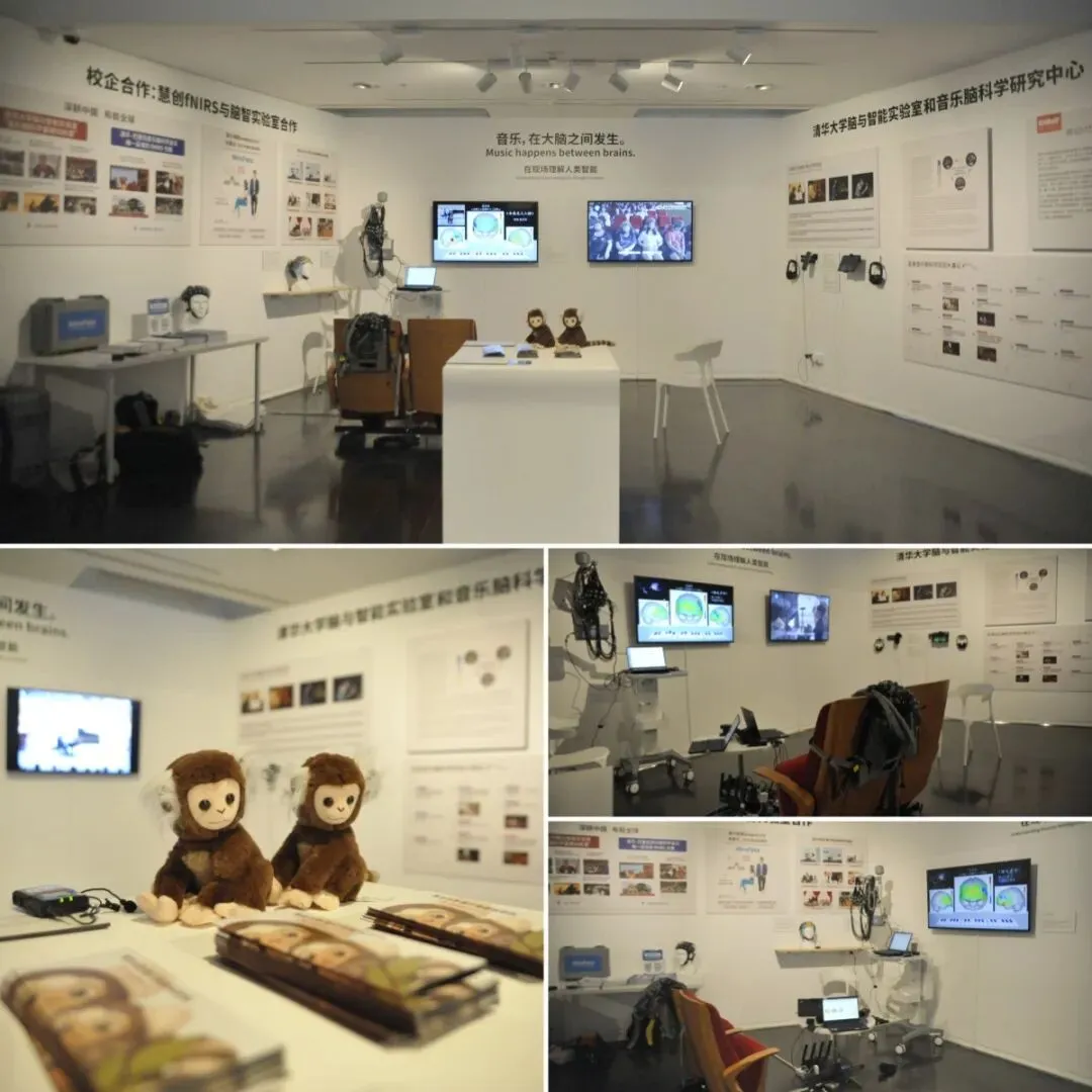 脑与智能实验室音乐脑科学研究中心作为参展科研机构之一,展示了其在音乐脑科学领域的研究进展,包括与艺术家孔祥东先生合作开展的“四音曲”即兴疗愈实验,以及与慧创医疗在近红外脑功能成像(fNIRS)技术方面的合作成果。