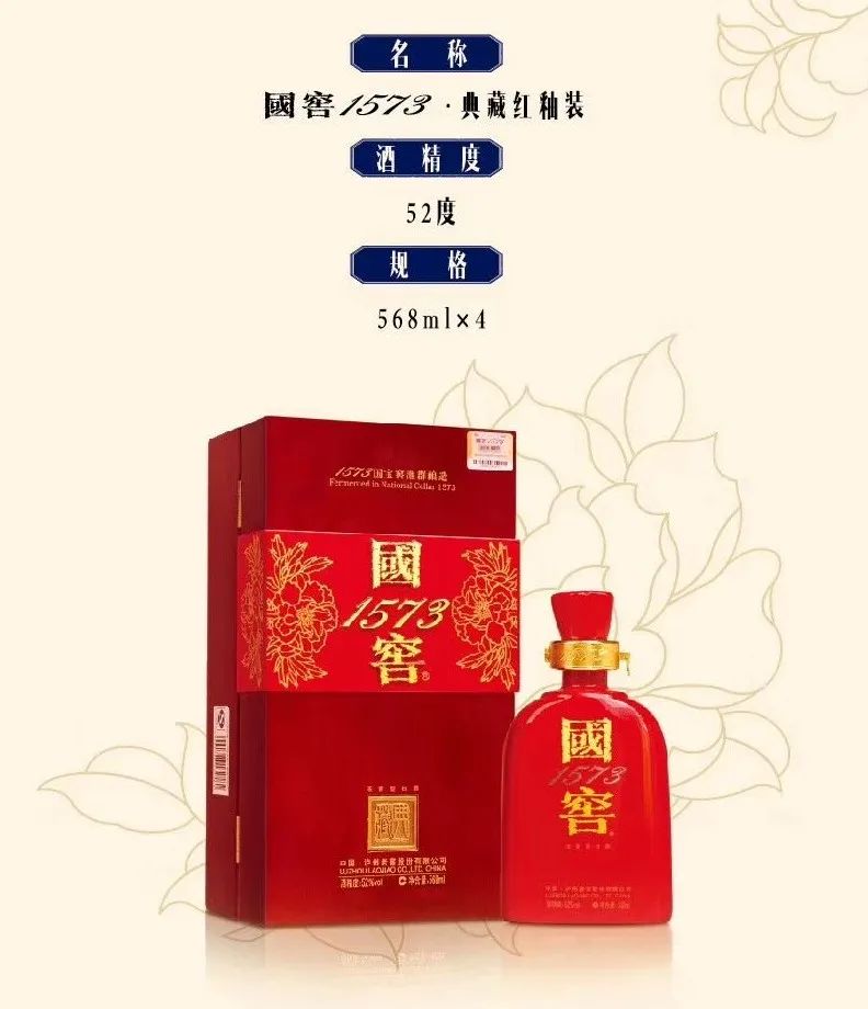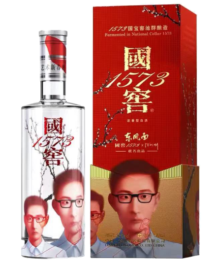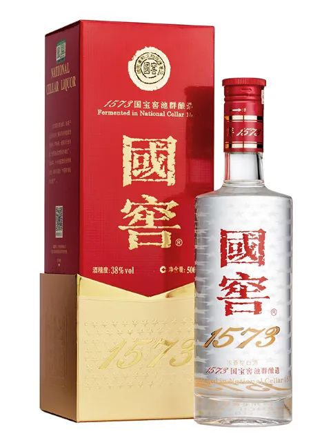 国窖1573是泸州老窖系列酒之形象产品,源于建造于明朝万历年间(即公元1573年)的“国宝窖池”,采用蒸馏酒酿造工艺,酒质无色透明、窖香优雅、绵甜爽净、柔和协调、尾净香长,风格典型。包装基座以金色五星蕙芷为装饰,呈现传统玉玺造型,外盒由大面积国旗正红为铺设,酒瓶采用国窖1573德国水晶玻璃烧制,瓶身与外盒有象征国土面积的五星960颗,“1573”字样以纯金压边。