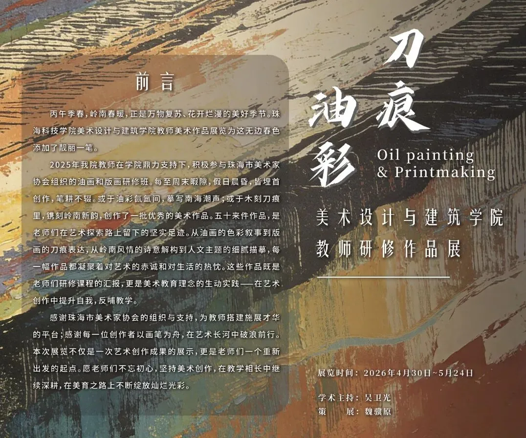 丙午季春,岭南大地春暖花开,万物竞发。在这充满生机与艺术气息的时节,由珠海科技学院美术设计与建筑学院、金湾区文化馆联合主办的“油彩·刀痕——教师研修作品展”于近日在金湾区文化馆正式拉开帷幕。本次展览,金湾区文化馆与学院携手从场地布置到宣传推广均精心准备,为展览成功举办筑牢根基。展览集中呈现学院教师参加珠海市美术家协会油画与版画研修班的创作成果,五十余件优秀作品成为春日珠海亮丽文化风景线。