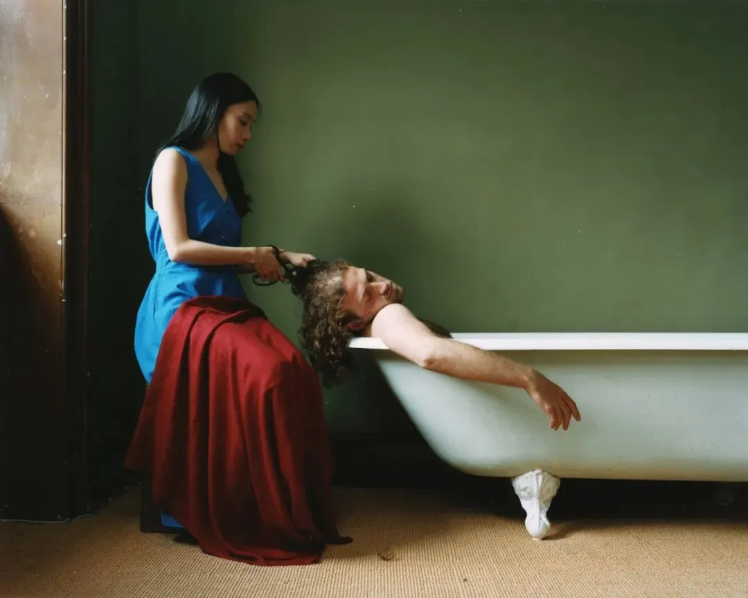 本幅作品以鲁本斯的《赛门和黛莉拉》为灵感,重构了这则圣经神话中关于背叛与去势的视觉隐喻。黎雨诗同时还借鉴了油画《马拉之死》的构图意象,将这个圣经神话置于一个室内的居家环境之中:男人仰卧在浴缸中,双眼紧闭,女人手持剪刀,静静地握住他的头发。这个动作成为一种潜在的暴力姿态,也象征这身体权力的重新分配 -- 神话中的剪发转化为一场象征性的“阉割”。 在这个静止而克制的画面中,作品将一个古老的神话转化为对当代性别关系的反思,让观众在熟悉与陌生之间重新感受欲望与力量、观看与被观看着之间的流动与变化。