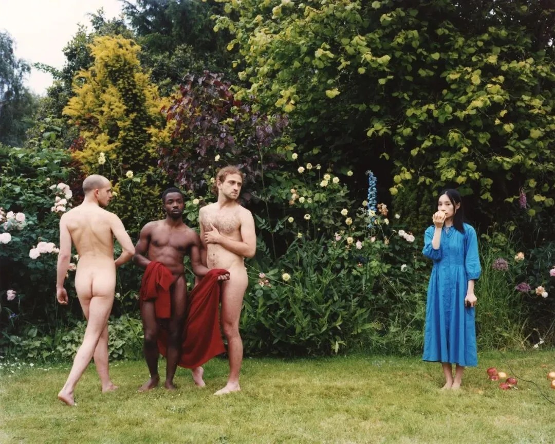 《The Judgement of Paris》既借鉴了同名的希腊神话,也回应了这一题材在艺术史中绵延已久的图像传统。在原始神话中,三位女神由一位男性作出评判,胜者将获得一只金苹果。此后,这一题材在西方艺术中反复出现,成为展示女性裸体、理想化美,以及权力与欲望如何彼此交织的经典场景。在黎雨诗的照片中,她成为了评判三位裸体男性的人物,从而对艺术史中“男性主动、女性被动”的二元结构提出质疑。散落在她脚边的多只金苹果,以及她手中似乎正要咬下的那一只,也进一步打乱了竞争的逻辑,邀请观者重新思考“评判”这一行为本身,以及支撑它的权力结构。