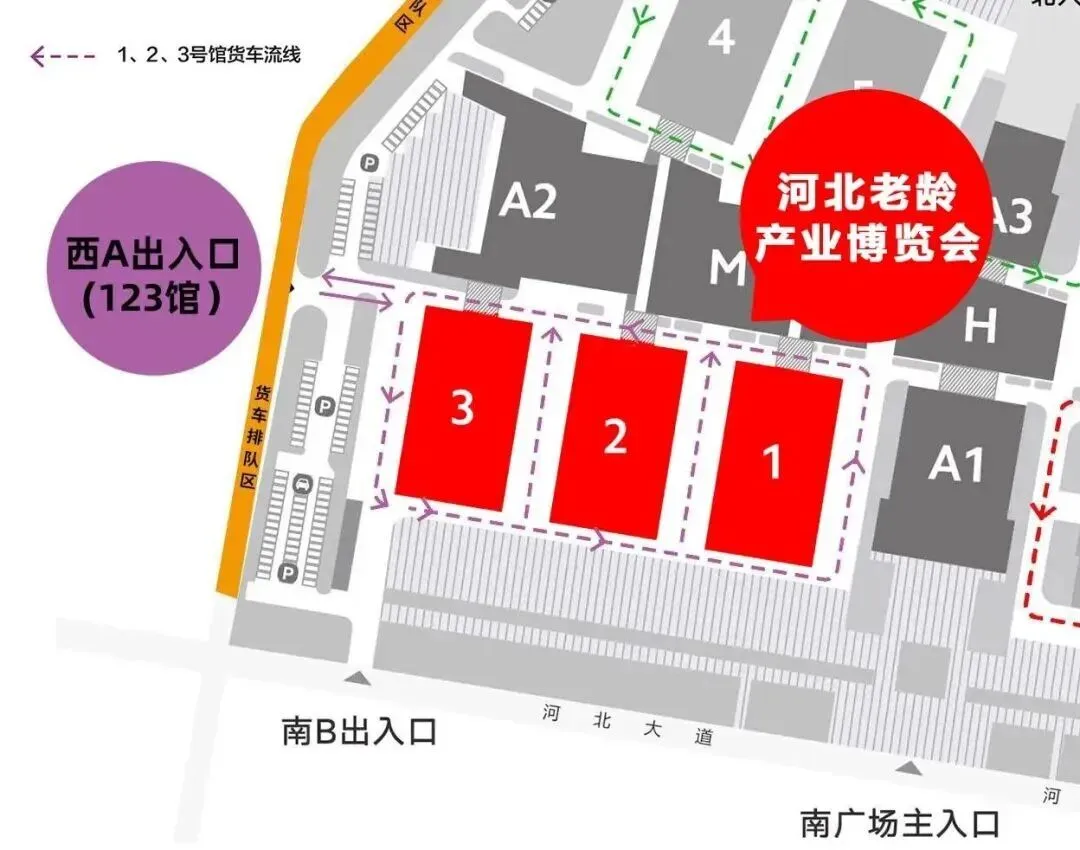 本次展会车辆请参照左下角1、2、3号馆线路行驶
