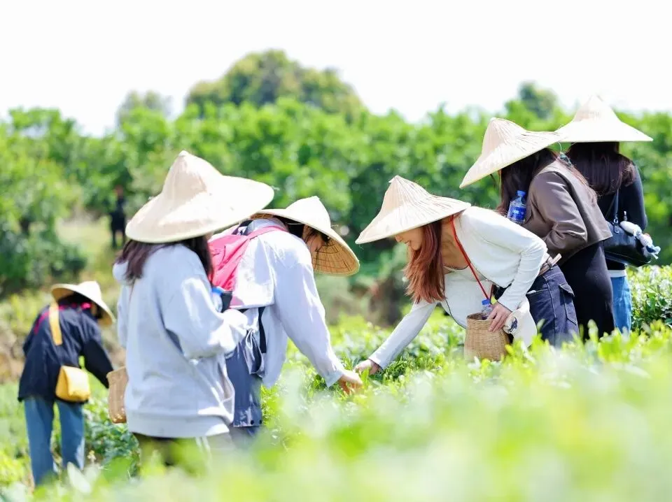 抵达茶园,满目青翠铺展山间。在工作人员的专业指导下,大家背起茶篓,走进茶垄之间,亲手采摘春日新芽。采茶过程中,大家近距离观察茶叶的形态、色泽与质感,沉浸式感受传统茶事文化的魅力,也在青山绿意之间放松身心、舒缓压力。