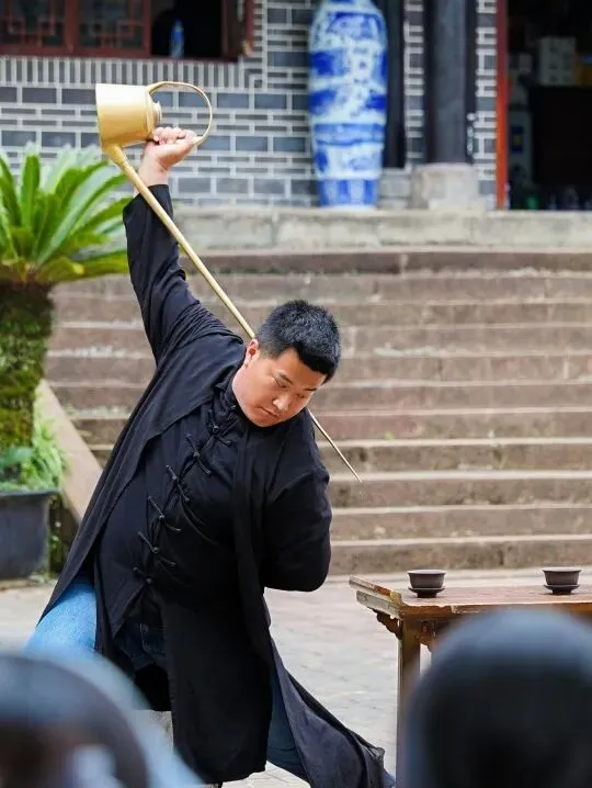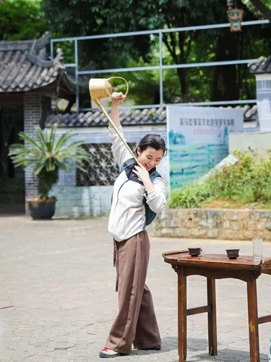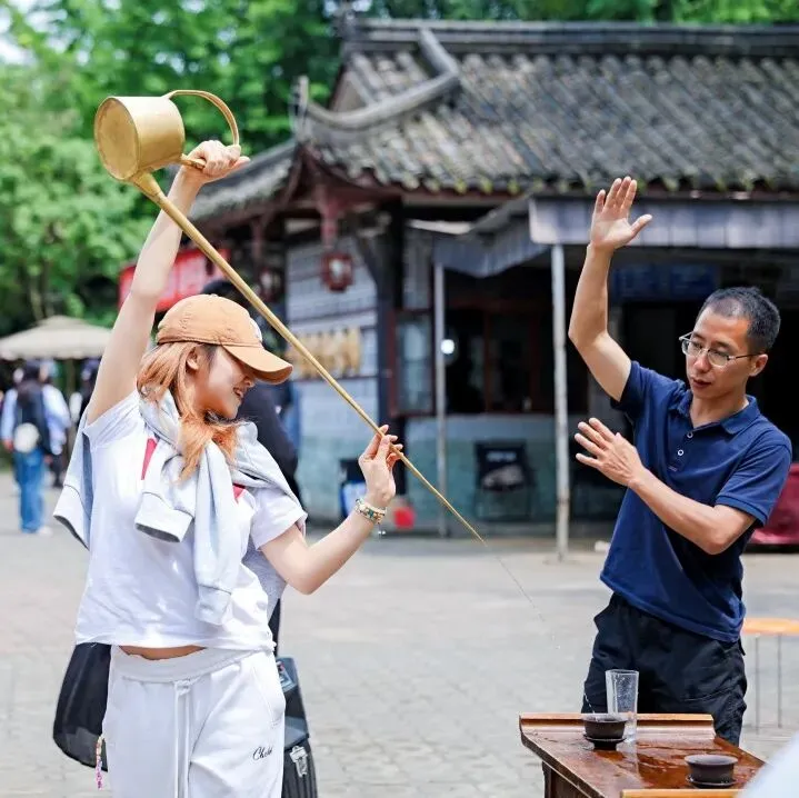 活动现场,川派长嘴壶茶艺表演惊艳亮相。表演者行云流水般演绎温杯、投茶、注水、出汤等整套流程,招式飘逸洒脱。观赏之余,不少中会小伙伴踊跃上前亲身体验,手持长嘴铜壶模仿招式,在尝试与切磋中趣味满满、笑语不断。