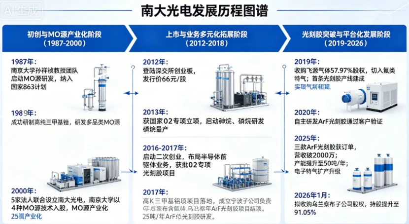 南大光电(300346.SZ)——南大光电成立于2000年,总部位于苏州工业园区,是一家专注于先进电子材料研发、生产和销售的高新技术企业。公司业务涵盖前驱体材料(含MO源)、电子特气和光刻胶三大核心板块,产品广泛应用于集成电路、平板显示、LED、光伏等领域。