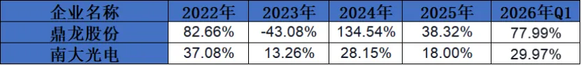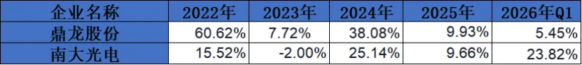 南大光电:增长率相对较为平稳,但也有波动。2023年出现负增长,为 - 2.00%,之后逐步恢复增长,2026年Q1达到23.82%。说明公司在面对市场变化时具有一定的调整能力,业务发展具有一定的韧性。