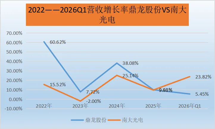 鼎龙股份:营收增长率波动幅度较大。2022年有较高的增长率,2023年出现大幅下滑至7.72%,随后在2024年显著回升至38.08%,之后又有所下降,2026年Q1为5.45%。这表明公司业务发展存在一定的不稳定性,可能受到市场环境、产品研发进度、行业竞争等多种因素的综合影响。