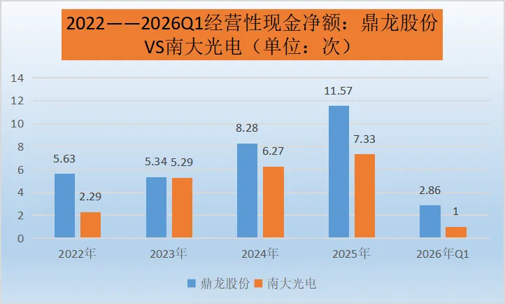 鼎龙股份:经营性现金流净额波动显著。2022 - 2025年呈现上升趋势,从5.63增长到11.57,显示公司在这期间核心业务的现金获取能力不断增强,经营状况持续改善,业务发展态势良好。然而,2026年Q1大幅降至2.86,可能暗示公司在该季度业务发展遇到一些挑战,或者存在季节性因素等影响,导致现金流入减少或流出增加。
