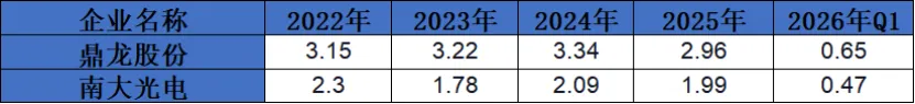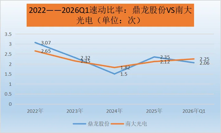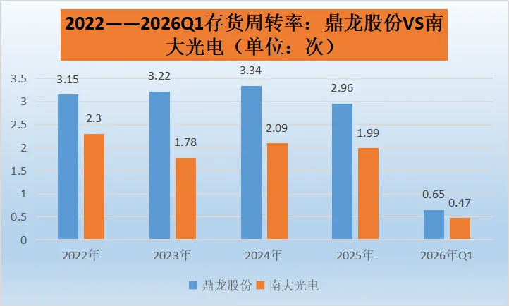 2026年Q1鼎龙股份和南大光电:两家公司存货周转率均大幅下降至较低水平。这可能是由于年初市场处于淡季,需求相对较低,导致产品销售速度放缓;或者是公司在生产计划安排上出现偏差,生产了过多的产品而未能及时销售出去;也有可能是受到供应链问题、物流延迟等因素影响,使得存货周转受阻。