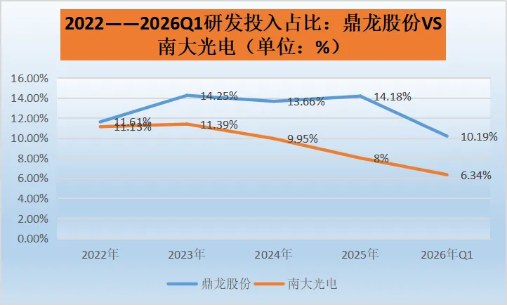 南大光电:整体呈现下降趋势,从2022年的11.13%逐步降至2025年的8%,2026年Q1进一步降至6.34%。这表明公司可能在前期已经取得了一定的技术成果,随着业务的发展和市场环境的变化,对研发投入的占比进行了适当控制,但也可能存在研发投入增长跟不上业务规模扩张速度的情况。